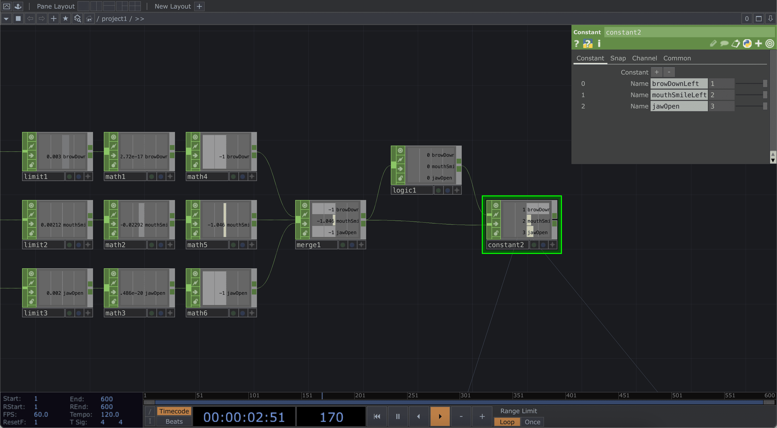 To resolve this, I reconfigured the data flow. First, I mapped each channel’s data range from 0-1 to 0.5-1 for better differentiation. I then merged the three channels into a single channel and passed it through a ‘logic’ node, set to ‘ON when greater than zero’. Using a ‘constant’ node, I classified each input as a specific index; ‘index1’, ‘index2’ and ‘index3’. Within the ‘switch’ node, this meant: