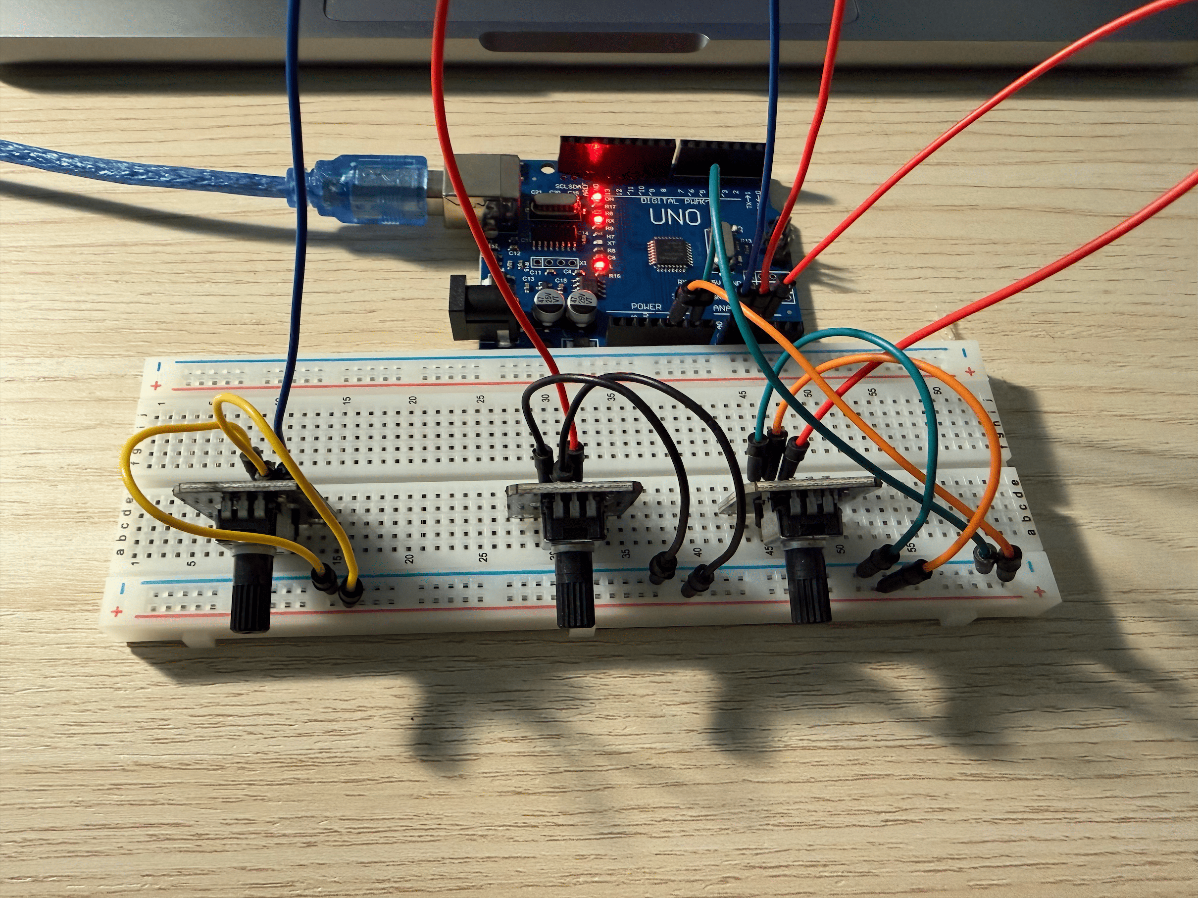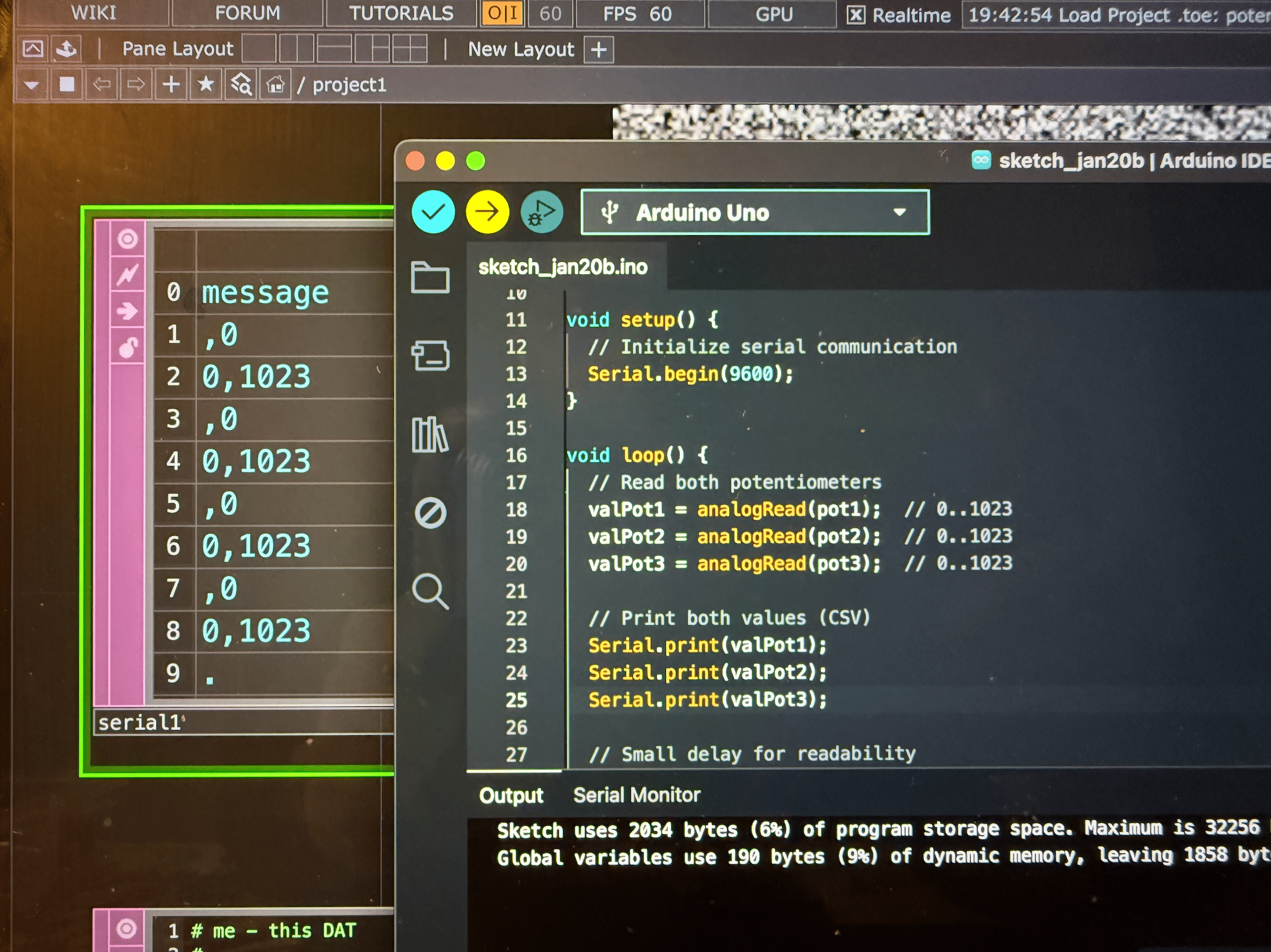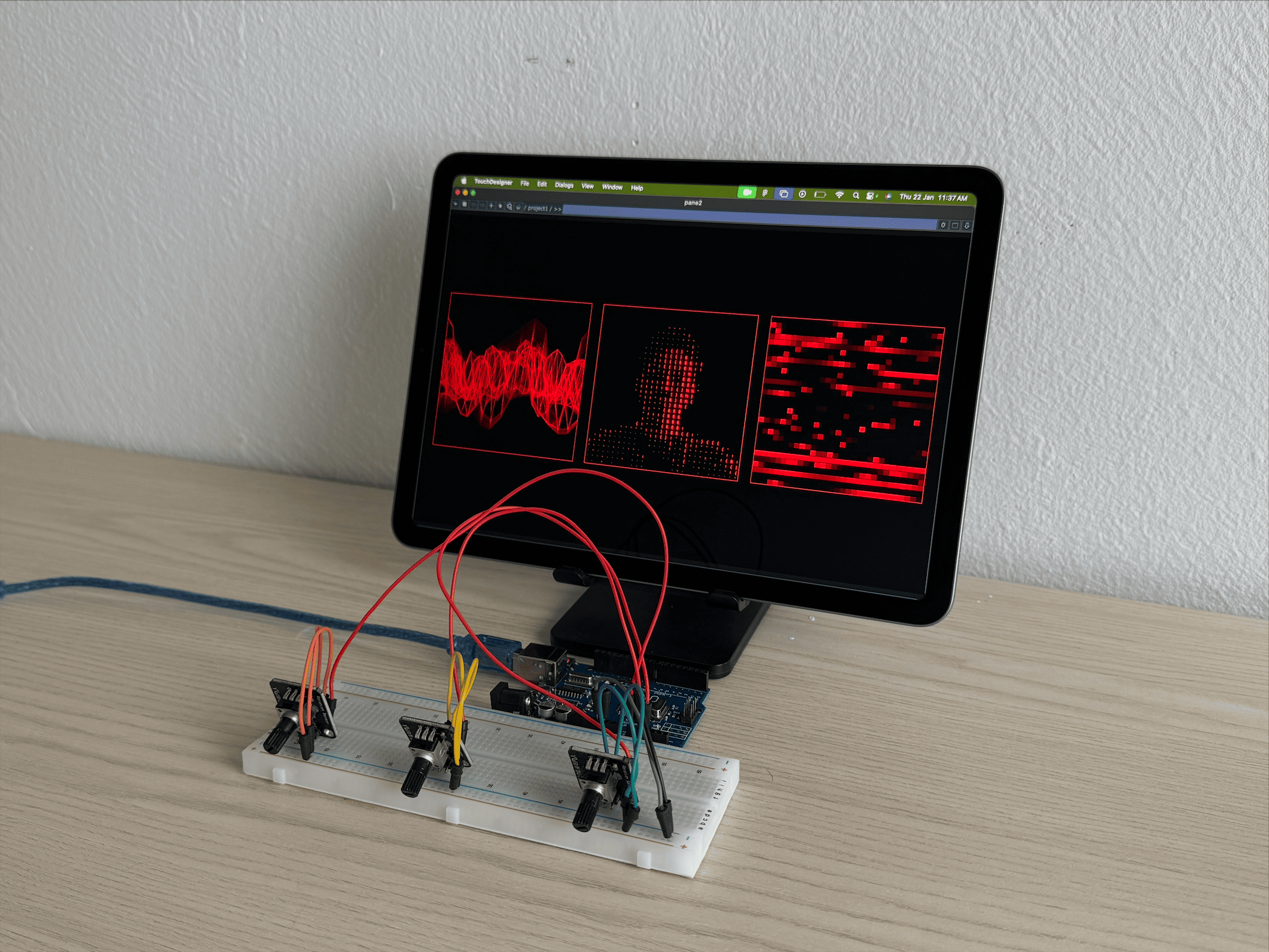 I purchased three potentiometers from Sim Lim Tower and wired them to an Arduino. While I managed to upload the code successfully, I ran into issues in TouchDesigner. I could not reliably separate the three potentiometer values into distinct channels without them interfering with one another. This made it difficult to map each input to specific visual parameters.