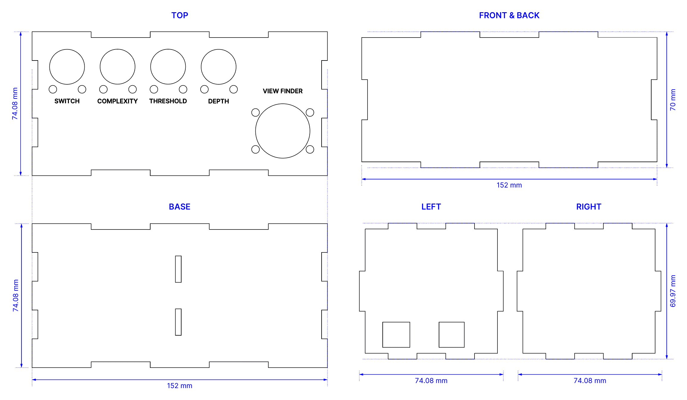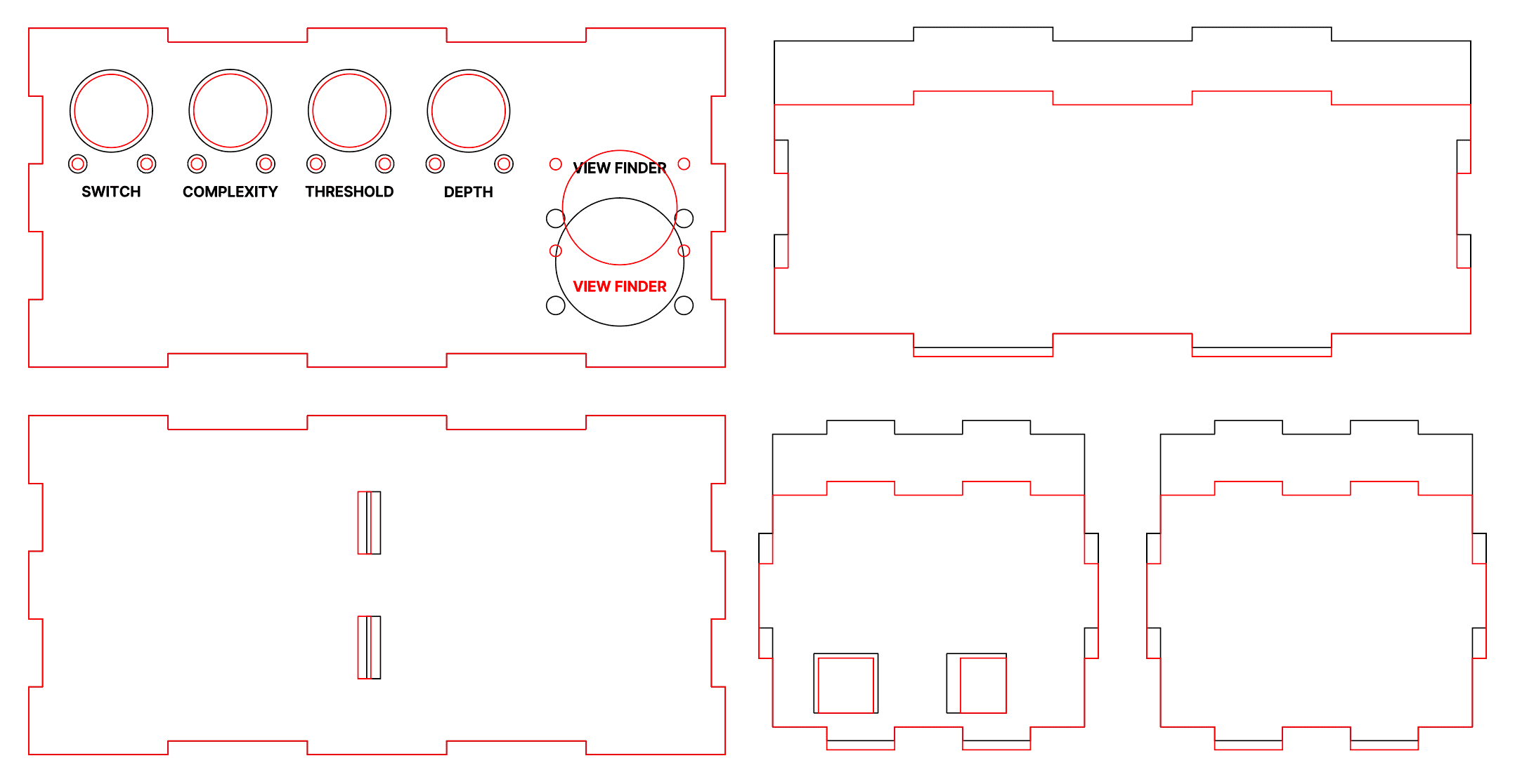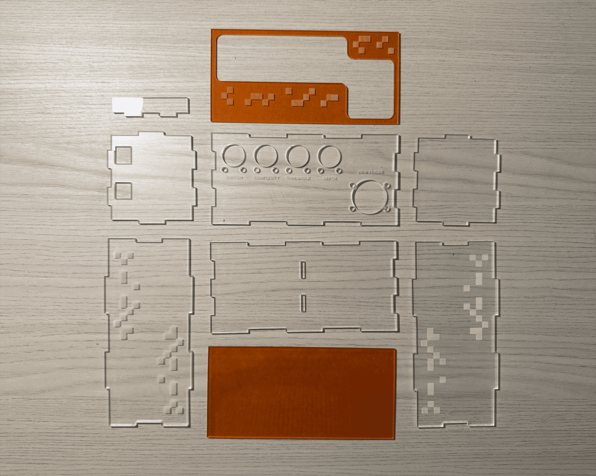 What consumed most of my time, however, was not the layout itself but the precision required in translating the sketch into a workable casing. Measuring diameters for screw holes, ensuring ample space for knobs and planning connector joints for the acrylic panels required meticulous attention. I brought the design into Adobe Illustrator to draft a popper blueprint for laser cutting.