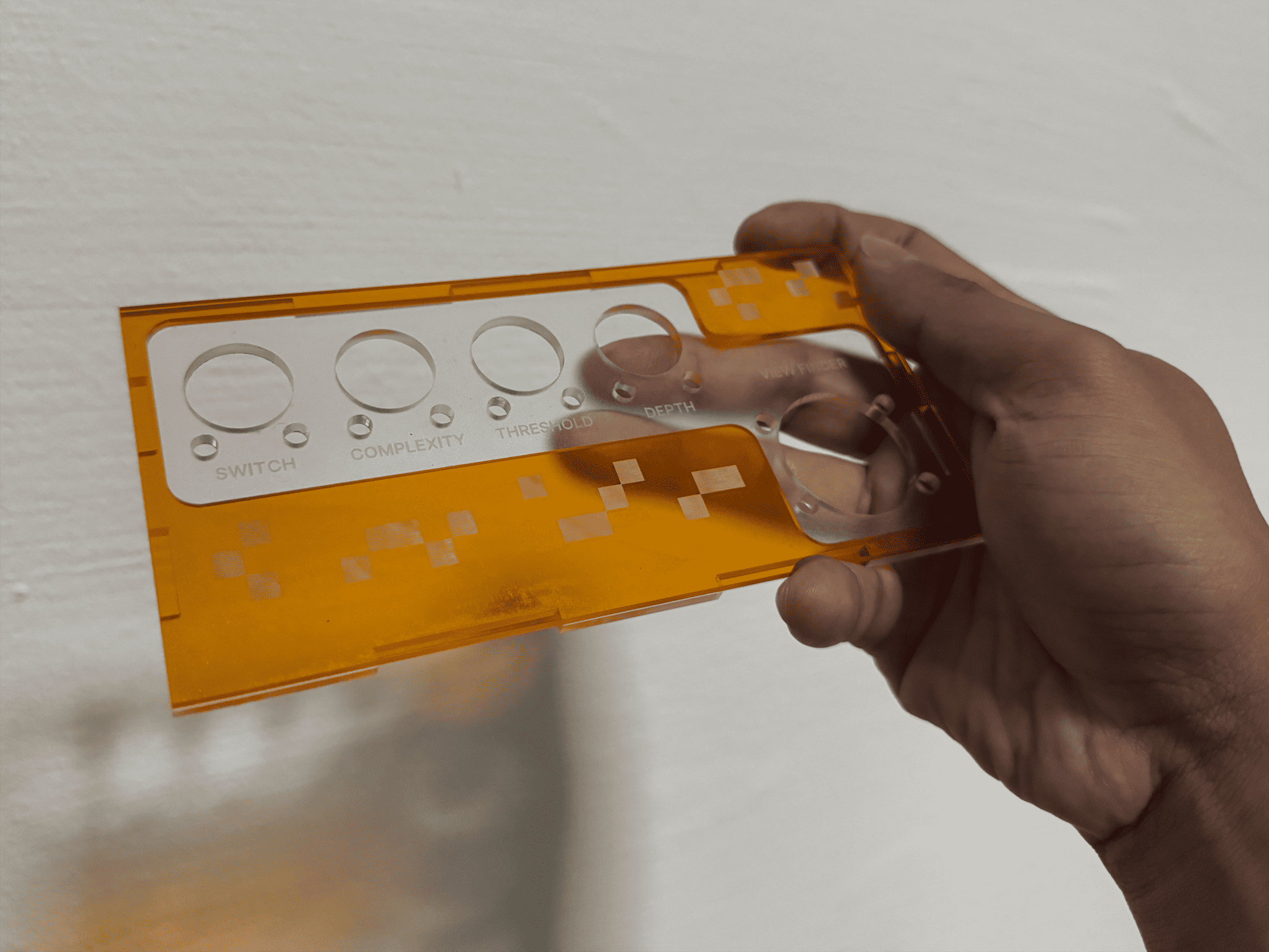 I began redrafting the casing with reduced dimensions and recalibrated hole measurements. Initially. I was merely resizing the original design without rethinking its form. Realising this, I paused and reconsidered the object entirely. Interestingly, I noticed that the top acrylic layer alone actually felt comfortable in my hand, ignoring its sharp edges.