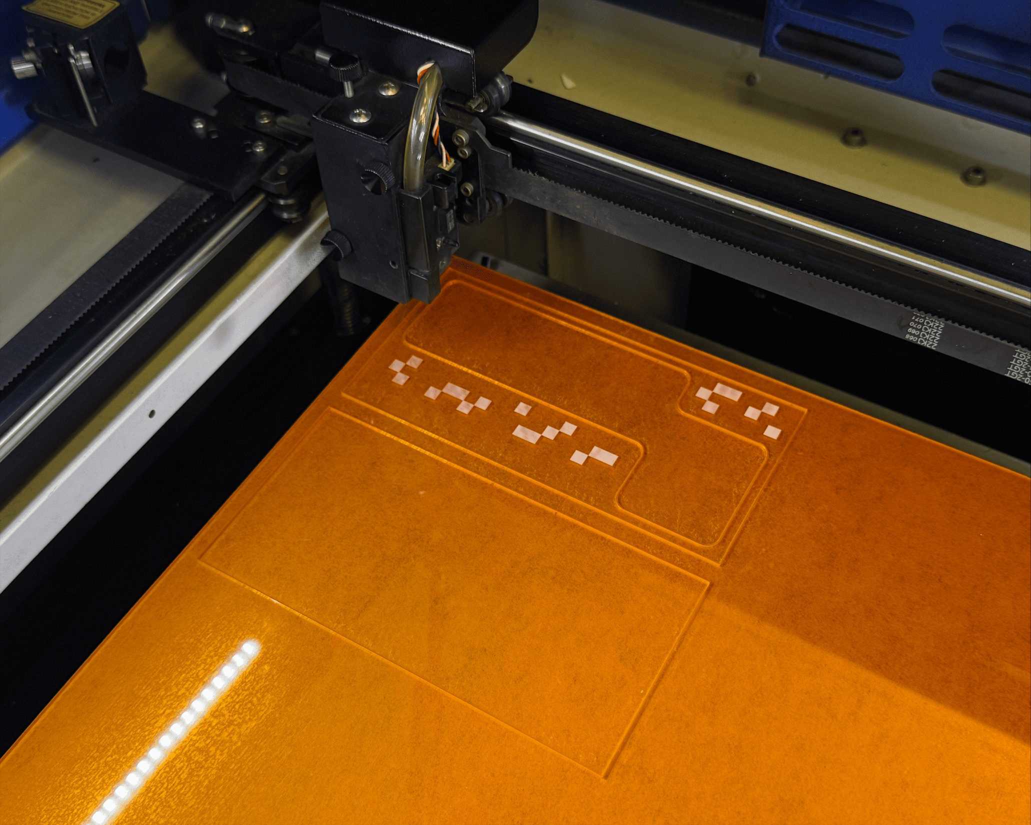 Thankfully, I was able to join my classmates’ during their laser cutting session. There were several rounds of testing to determine the correct power and speed settings before cuting the actual pieces. I chose frosted white acrylic for the main body and transparent orange acrylic for accents, hoping to achieve a clean yet slightly futuristic aesthetic.