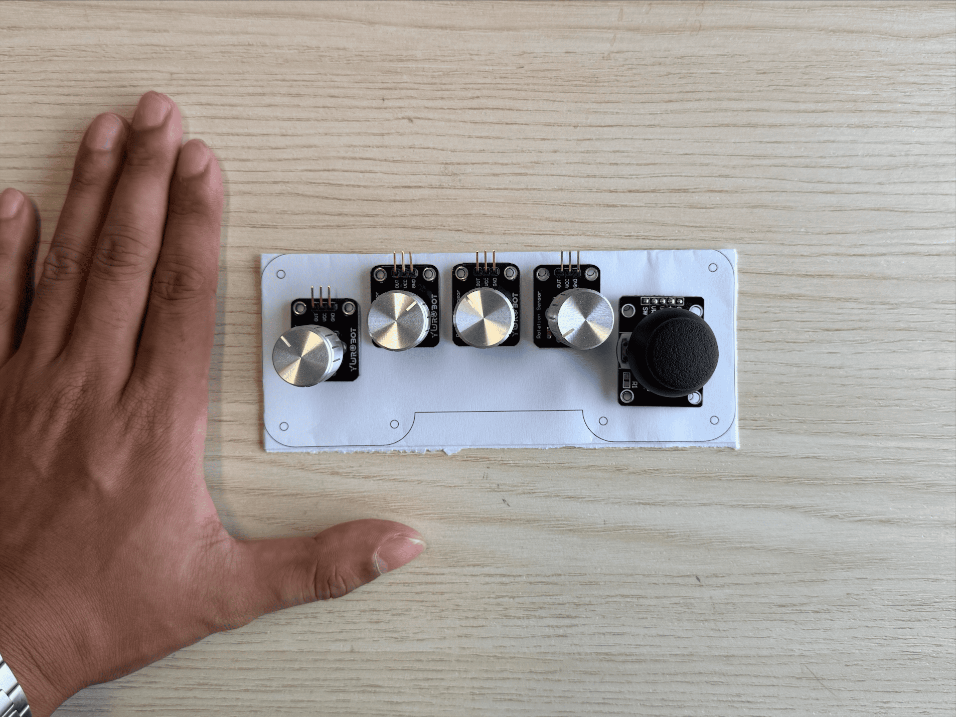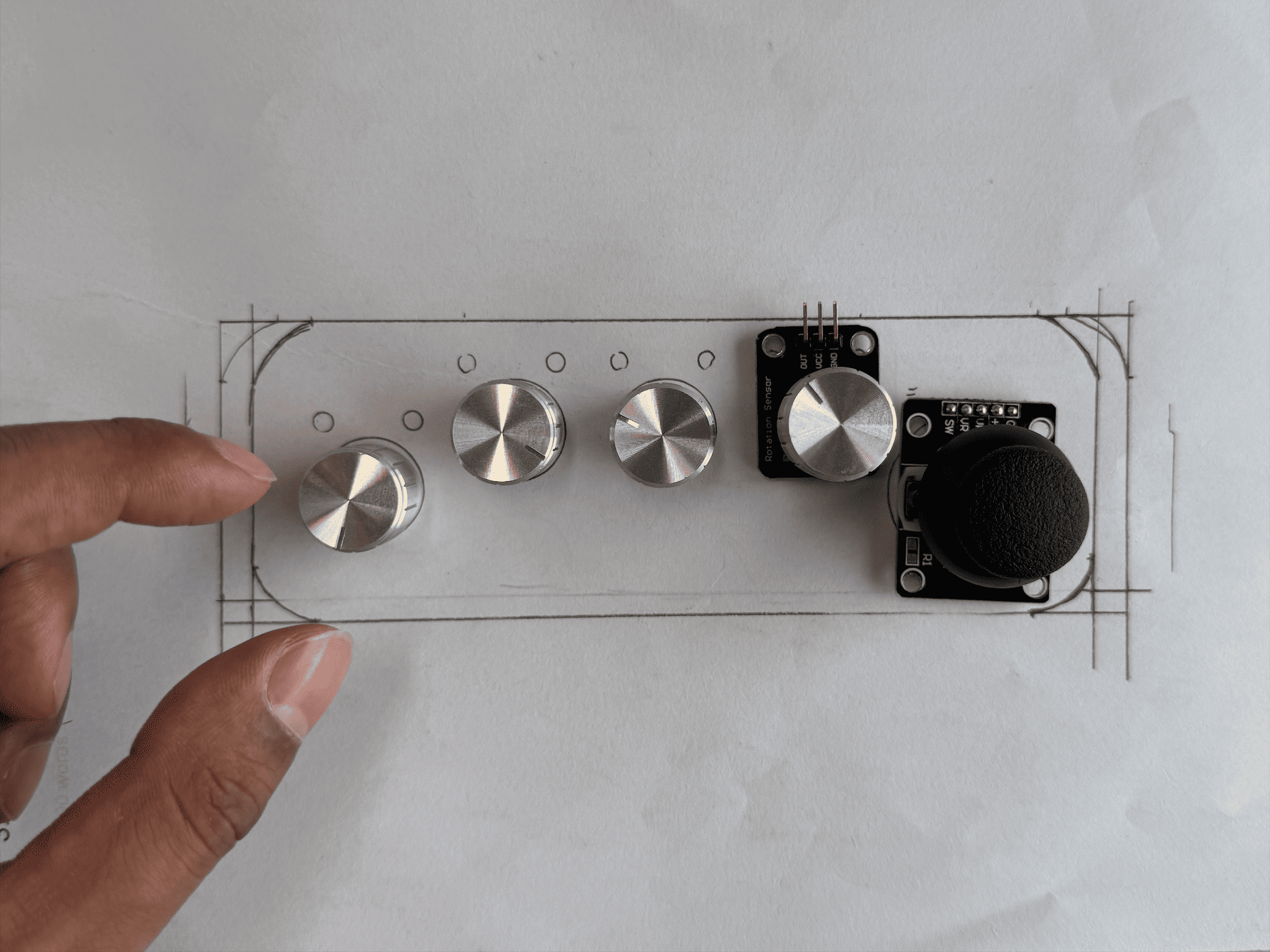 This week, I directed my focus entirely on making the controller. I began by sketching multiple layout variations for the four potentiometers and one joystick. After exploring several arrangements, I settled on a configuration where the potentiometers were aligned in a row, with the joystick positioned on the right-hand side for ergonomic access.
