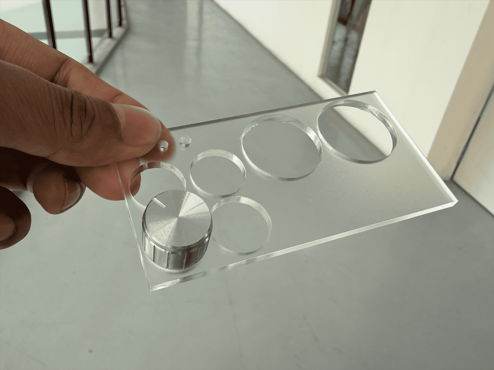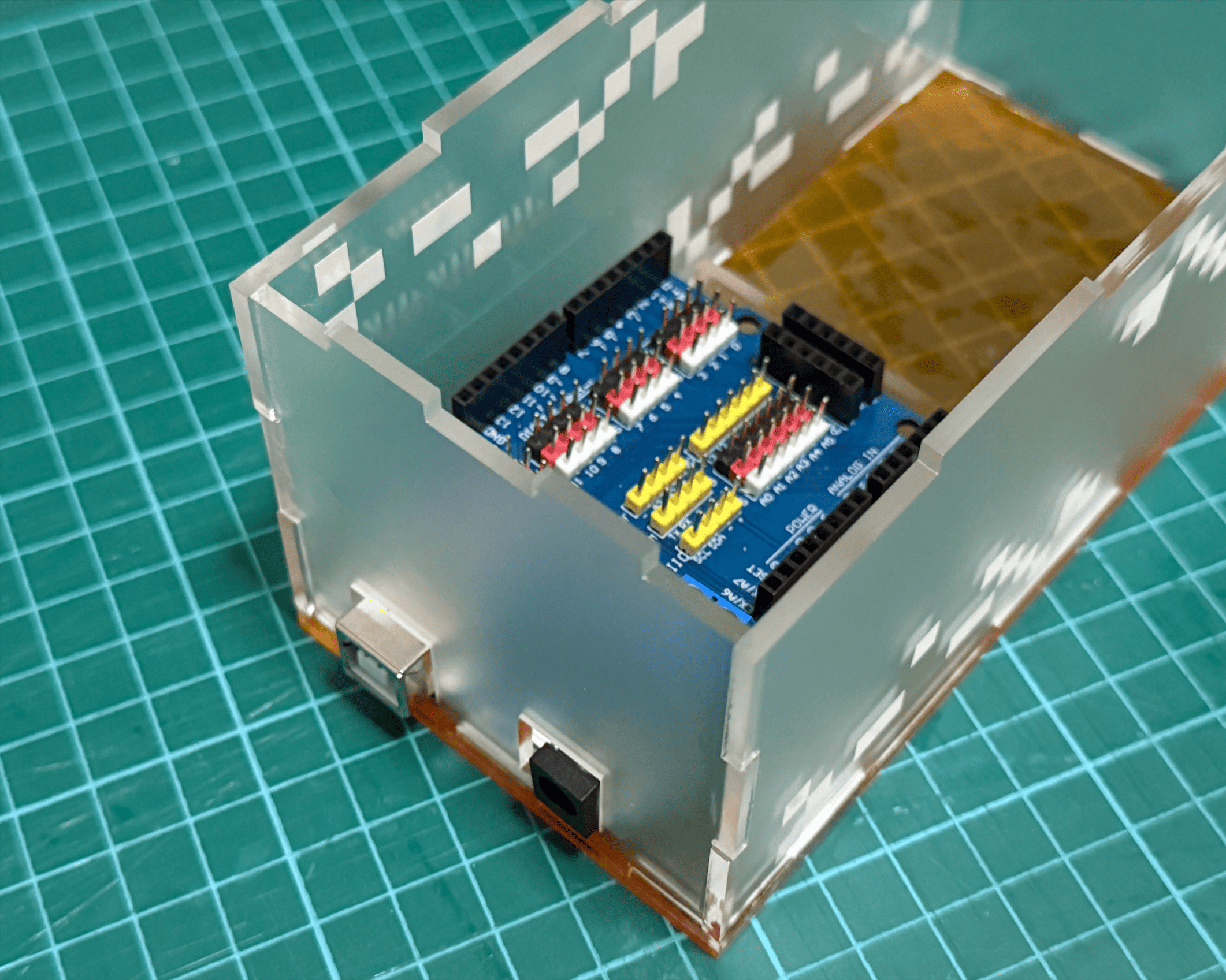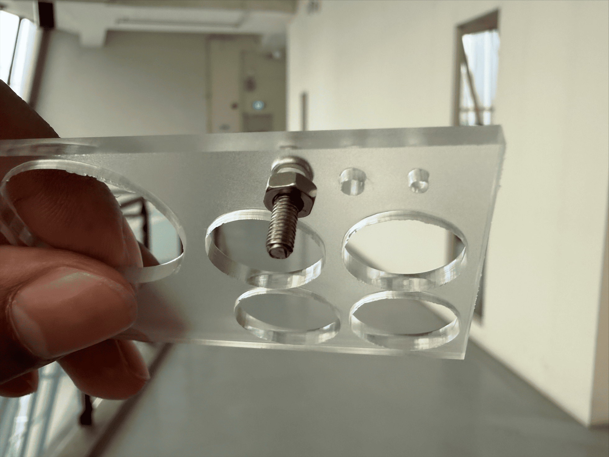 Before even assembling the first prototype, I was already confronted with multiple design flaws. Some holes were misaligned due to parallax errors during measurement. Several were too large for the screws and caps, causing instability. More critically, I failed to account for the height of the module pins on the module. As a result, when mounted, the module pins were hitting against the underside of the acrylic and I could not screw the components tightly, causing the components to dangle awkwardly.