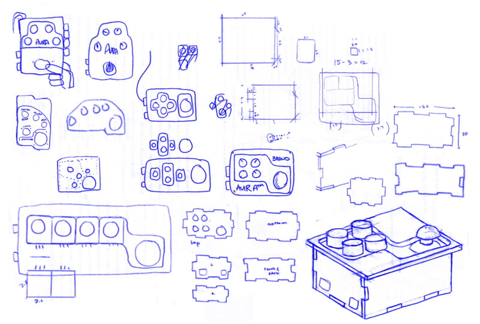 I began to work with the components on paper, sketching compact shapes around the components. I rounded the corners and refined the silhouette to resemble something closer to a handheld gaming console (smaller, softer and more intuitive to grip).
