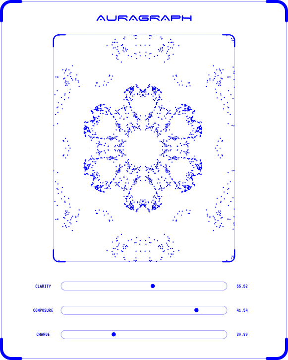 For AURAGRAPH, I replaced the previous generative visual with the symbol-generation system developed in last semester’s Experiment 005 EMO.GIFS. In this version, the generated symbol becomes the user’s emotional signature. At the same time, as the users manipulate parameters through the controller, the system will reinterpret these inputs to correspond to the aura colour.