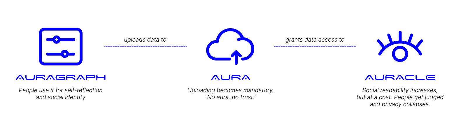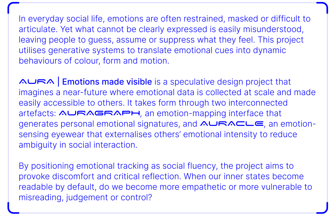 For instance: What happens if a citizen refuses to upload their emotional data? What if someone’s aura appears volatile or unstable? Would others avoid them? Would AURA intervene? These speculative tensions are precisely the kinds of questions I hope the audience begins to consider.
