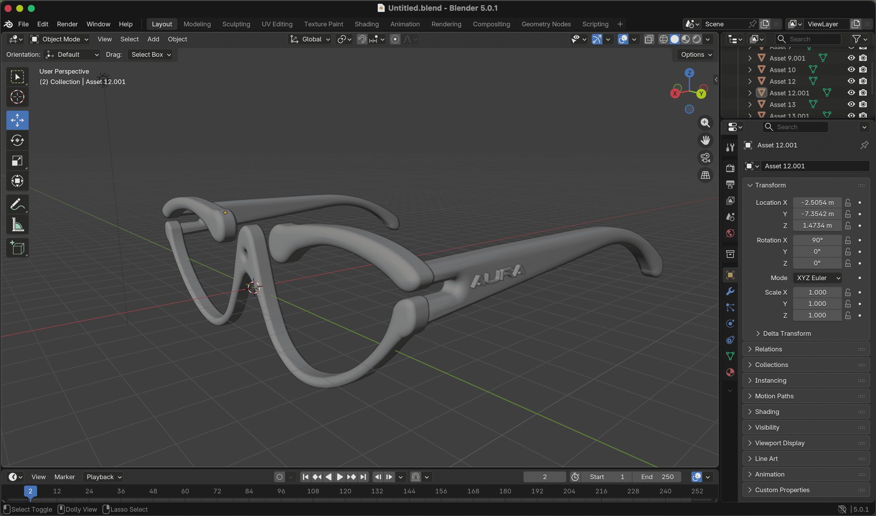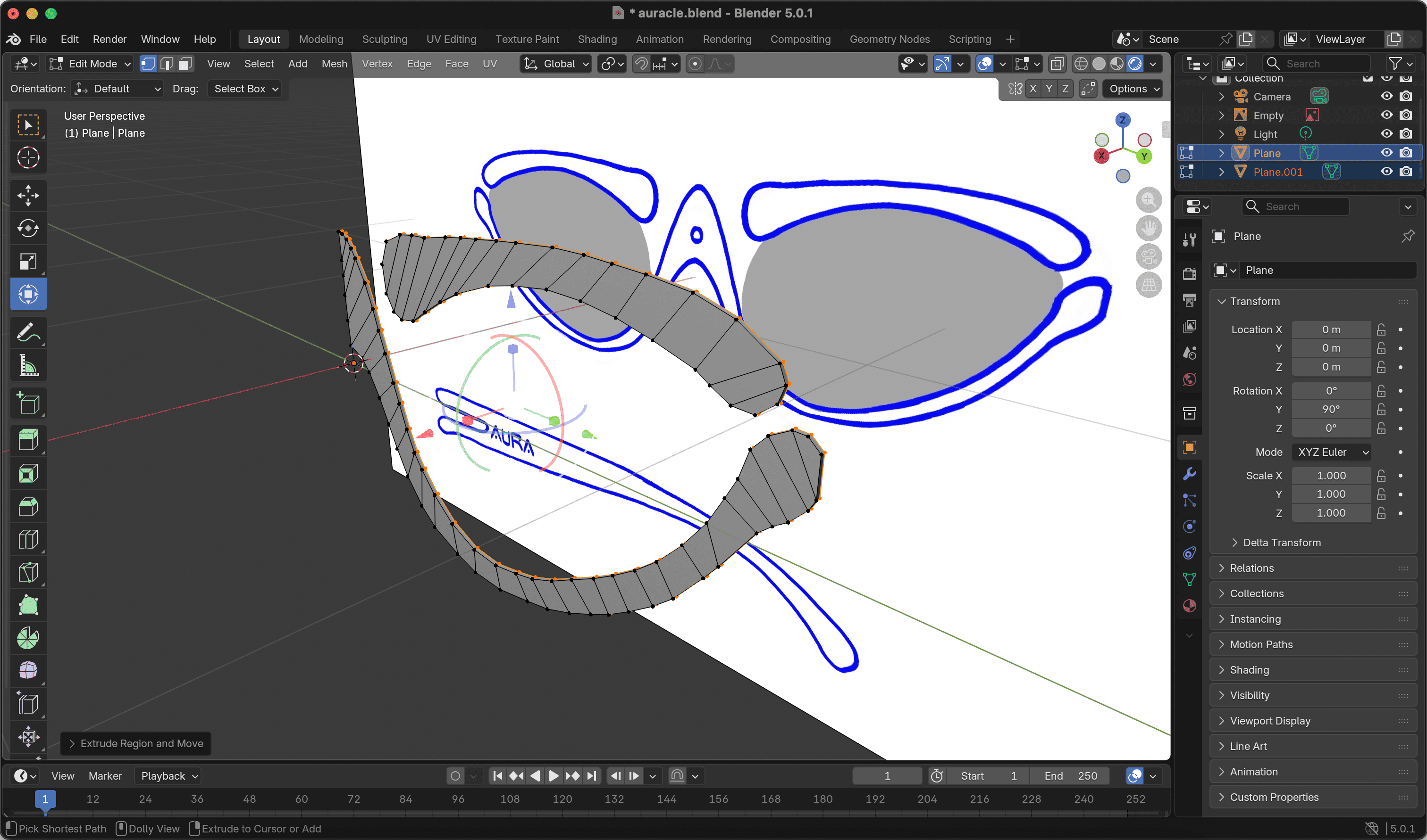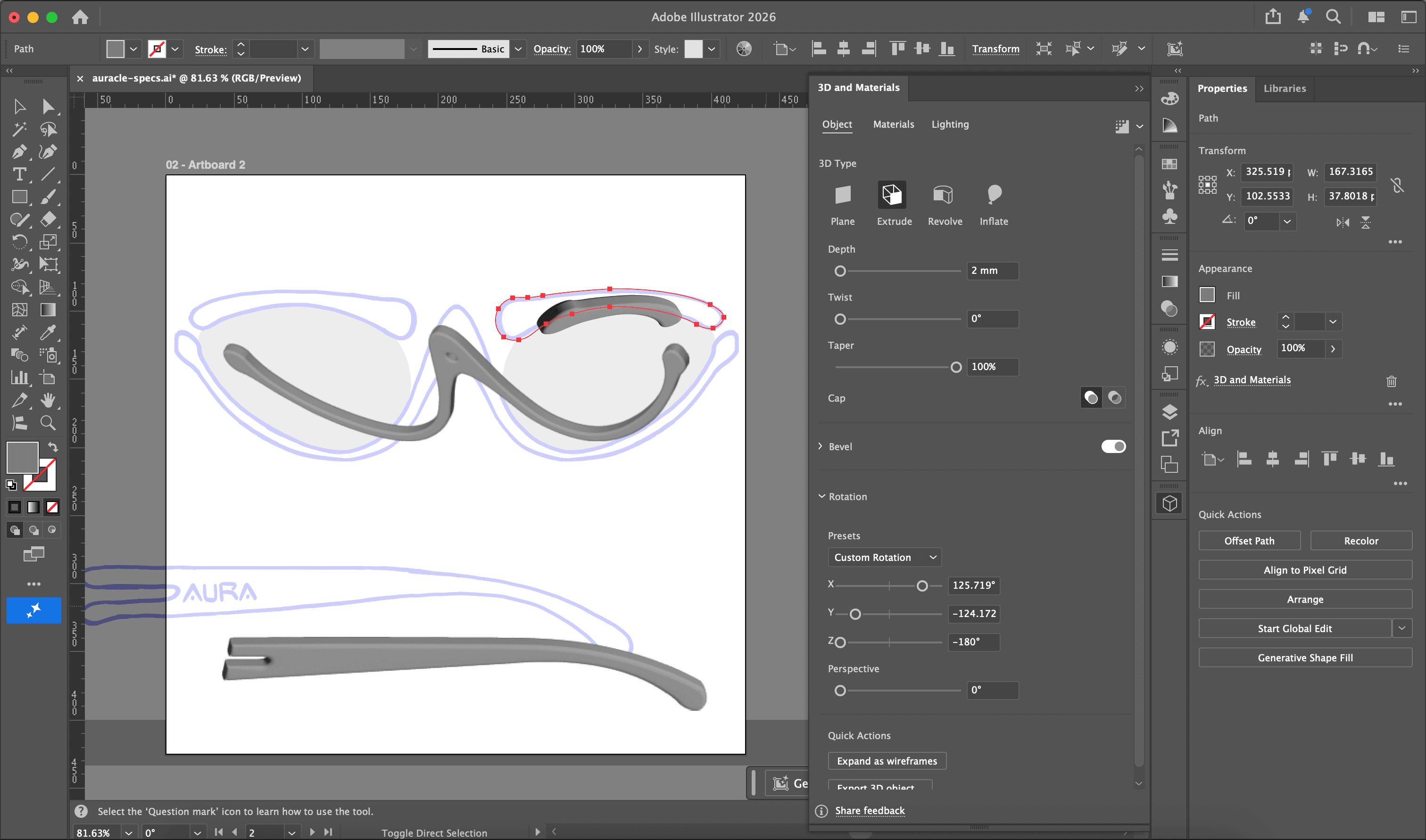 Back in Year 2, I had experience exporting 3D assets from Illustrator into Blender as .obj file before. Illustrator allowed me to extrude vectors into 3D forms with much more control over thickness and bevel. (I’m pretty sure Blender can do it too, but I don’t know the software that well) Although this workflow required repeated exporting and importing of files, it allowed me to model the eyewear with greater confidence and precision.